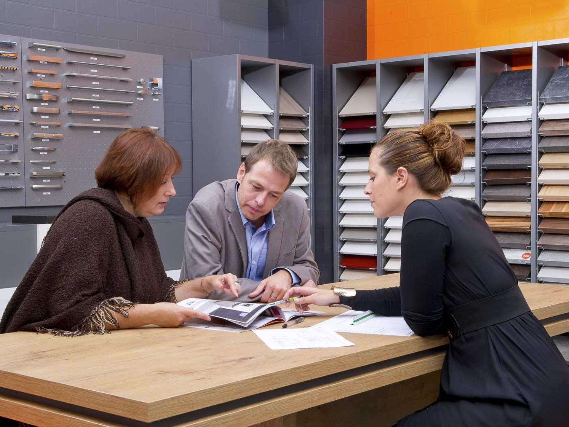 Prises de vue de l’accueil, des espaces de ventes (des alcôves discrètes, confortables, où le client peut suivre la conception de son projet à partir de l'ordinateur du vendeur ou en projection grand format sur écran), de l’atelier de composition spécifiquement dédié à la composition du projet : façade, plan de travail, crédences, robinetterie, poignées…